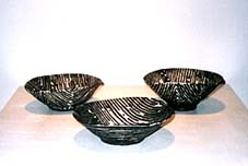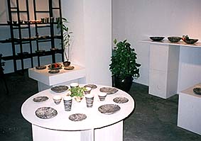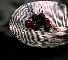 前回の個展の際、アフリカ・クバ族の草ビロードを 持参され、その美しさ・端正さを二人で堪能した。 「こんな作品が作りたいなあ・・・」 というわけで今井兵衛の新シリーズ発表! 皿・碗という単純なフォルムの表面 を白と黒のスト ライプ、ゼブラのような文様が意匠として施されて いる。実にミニマル!土の成分、焼成方法、釉薬、 テクスチャー、いたるところに技術の深さと研究心 を発見。真紅の花と果 実を粋に演出してみました。