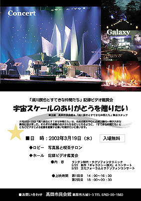 厳冬そしてあいにくの雨もようにもかかわらず、この舞台いっぱいに幼児・小学生から、お年寄りまでのたくさんの人たちで賑いあちこちで感動の声とよろこびの微笑みがみられました。そこには観客はもちろん、雨の中で裏方作業を手伝うたくさんの人たちの姿があり「参加しよう」「共に創ろう」「共に考えよう」「共に楽しもう」と目指す心を一つに、調和の渦「ギャラクシー銀河」が実存しました。みんなが一体となり、熱い思いでこの事業を成功させたのです。まさに、この事業のテーマ「人間讃歌」であり、「すてきな仲間たち」でありました。この大きな絆を大切に、このまちの明日の事業で、また再会することを楽しみに・・・・。