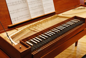 音律楽器であったモノコードに鍵盤機能がついたクラヴィコードは、17〜8世紀のヨーロッパ全土で広く愛用されたといわれている。誰かのために演奏されるのではなく、演奏の練習や作曲の手助けとして重宝がられていたという。タンジェント(金属片)が弦を突き上げるメカニズムによって、ピアノやチェンバロにはない独特の微妙な音のニュアンスが醸し出される。今回の公演で使用される楽器は、1780年代のドイツの楽器製作家フーベルトのクラヴィコードが原形として山野辺暁彦さんが製作したもので、ある同じ弦を異なる鍵盤で鳴らす共有弦タイプに属している。