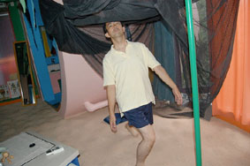 や凹を探りながらゆっくりと動き始める。2本のバチでドラムを叩くように、木琴やガムランを演奏するように、両足を揃え、あるいはばらばらに動かす。手もいっしょに動き始める。床を叩き、それから胸を叩く。体をひねり、足を交差させ、わき腹を床につけて反対のわき腹や背中を叩いていた。