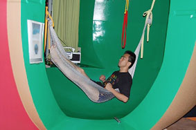 自分の声が部屋の中で反響する。つぎは「アーーーー」と声を出す。自分の声の反響の中に、ハンモックの中で宙ぶらりんになっている自分がいた。自分の発声機構の内的ヴァイブレーションと、声と球形の書斎がつくりだす音波のヴァイブレーションが一体化して、自分の内側と外側の区別